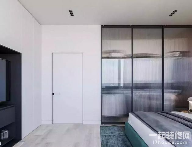 主卧室的收纳设计也不少,床的侧方是磨砂玻璃做的嵌入式衣柜,还加上了藏光的设计。床尾是白色的到顶柜子,还把电视也嵌入了柜子当中。